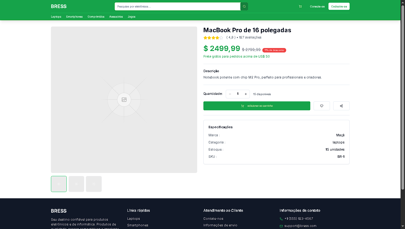 Sistema de visualização de produtos com avaliações, especificações e controle de estoque