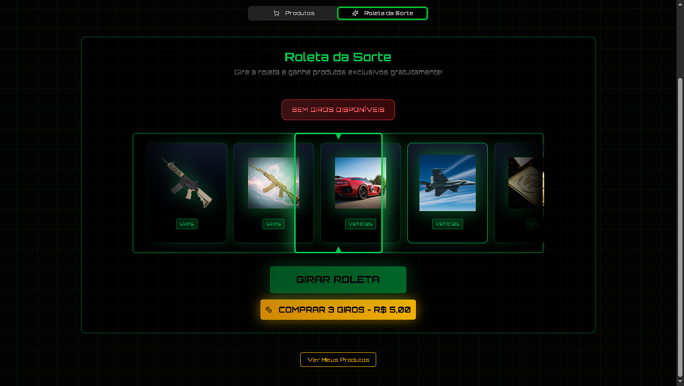 Sistema de roleta interativa com produtos exclusivos, skins e veículos para servidores de jogos